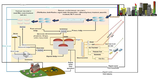 The paradigm shift to resource recovery is also observed in the wastewater sector. Wastewater treatment plants (WWTPs), in addition to the production of excellent quality effluent, can become Water Resource Recovery Facilities acting as proactive resource producers (Figure 1). Sewage sludge (SS), the by-product of wastewater treatment processes, can be used for biogas generation in the anaerobic digestion (AD) process. In fact, its co-treatment in WWTPs with other biodegradable waste (e.g., fat wastes, organic fraction of municipal waste) in the co-digestion process has been increasing over the last few years [3,4]. Physical and chemical properties of the co-substrates added to AD bioreactors in WWTPs have a significant impact on the co-digestion process and the quality of digestate. Generally, during the co-digestion process, a higher biogas production as well as higher volatile solids degradation are observed [5]. As shown in the study conducted by Grosser [6], co-digestion of sewage sludge, grease trap sludge (GTS), and the organic fraction of municipal solid waste (OFMSW) resulted in an increase in methane yield of 82% and volatile solids removal of 29.5%, compared to the digestion of sewage sludge alone.