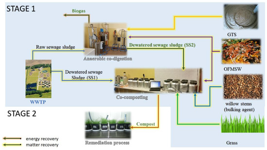 The novelty of the submitted manuscript is assessing how sources of sewage sludge (i.e., from anaerobic digestion or anaerobic co-digestion) as well as their share in the mixture affect the composting process and, subsequently, the compost quality in terms of its potential feasibility in the remediation process. The experiment was conducted over a period of several months and divided into two diverse stages. Stage 1 corresponded to composting of sewage sludge with municipal solids waste and grass. In the second stage of the research, composts obtained at stage 1 were used in the remediation process of degraded soil.