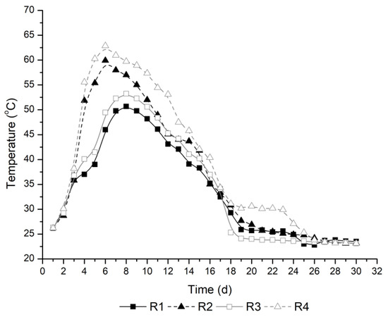 One of the most useful parameters of composting process monitoring is temperature because its variation is very well correlated with organic matter biodegradation. Figure 3 shows the temperature changes in the bioreactors. The temperature increased sharply during 6 days of composting. The thermophilic phase at reactors R1 and R3 was shorter than it was at R2 and R4, and, moreover, a lower temperature was achieved (<55 °C). It could indicate that the exothermic process was stronger in R2 and R4 because of the digestate properties from the co-digestion processes of sewage sludge and fat rich waste. As shown in Table 3, the concentrations of palmitic acid (C16:0) and oleic acid (C18:1) were nearly three and more than four times higher in the digestate from the co-digestion process than in digestate from the municipal WWTP. This indicated that both the percentage of sewage sludge in the mixtures and the type of sludge affected the temperature development during the aerobic stabilization process. Similar results were found by Gea et al. [24] during the composting of sewage sludge with animal fat mixtures. It was found that because of the longer thermophilic phase, the co-composting process of fats and sludge can be successfully carried out to obtain a sanitized and stabilized product. Moreover, the authors recommended addition of fat-enriched wastes to feedstock with low energy content in order to fulfill the international requirements for compost sanitation.