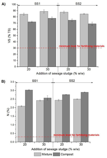 Total (TS) and volatile solids (VS), pH, total nitrogen (TN), and total carbon (TC) concentrations were analyzed according to the Standard Methods for the Examination of Water and Wastewater [20]. Nitrogen was extracted by the Kjeldahl digestion method using Büchi Distillation Unit K-335 equipment followed by distillation. Total carbon was measured using a TOC analyzer (Analytik Jena Multi N/C 2100). All raw materials, compost, and biomass were analyzed for the presence of heavy metals using an ICP-OES spectrometer (Thermo Electron IRIS Intrepid II), after prior digestion of the samples with a mixture of concentrated hydrochloric acid and nitric acid (aqua regia) in a microwave digester system (ETHOS Easy, Milestone). Salmonella was detected according to the standard method [21]. Helminth eggs were monitored in compliance with [22]. Additionally, loss of organic matter (OM) was calculated based on the formula shown below [23], where X1 (% TS) and X2 (% TS) are the initial and final ash, respectively.