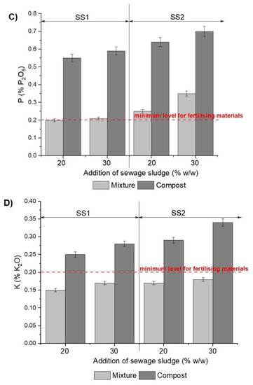Because composts are organic fertilizers, their composition was compared with the regulatory requirements specified in the Polish regulations [34]. According to this regulation, organic fertilizers should meet the following requirements: organic matter content no less than 30%; total phosphorus (expressed as P2O5) no less than 0.2% (m/m); total nitrogen no less than 0.3% (m/m); total potassium (expressed as K2O) no less than 0.2% (m/m). The organic matter and NPK contents in mixtures and final products are presented in Figure 4. With respect to the mentioned parameters, all composts fulfilled the assumed concentration.