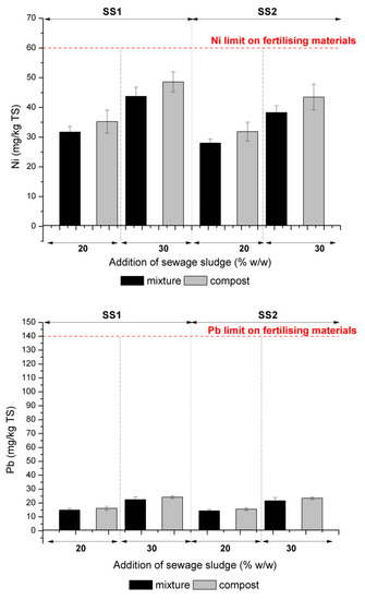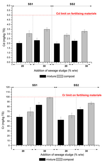 The ordinance also specifies the permissible concentration of heavy metals (Cr, Cd, Pb, Ni and Hg) and the content of microbial contamination in fertilizers. The presence of heavy metals in fertilizers may cause negative environmental effects. This risk increases when waste such as sewage sludge is used for the production of fertilizers. The concentration of heavy metals in all composts did not exceed a permissible level (Figure 5). The content of Hg was below the detection limit in both mixtures and composts. However, it should be noted that the content of Cr was relatively high in all composts, and in the case of R3 it was close to the acceptable limit. This was due to the high concentration of this metal in the sewage sludge. Studies conducted by Kominko et al. [9] on sewage sludge from the same WWTP also showed a high concentration of this metal (over 300 mg/kg TS). The heavy metals content in digestate is crucial for its use as a feedstock for the production of fertilizers or soil improvers.
