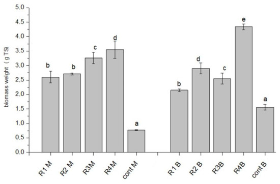 In terms of biomass yield, it was found that all used composts caused a significant increase in fescue biomass (Figure 6). Moreover, with R4 compost application a much higher biomass generation was achieved, compared to R1, R2, and R3 compost application for both types of soil. In the control sample (cont M), very poor plant growth was observed, which was associated with very high contamination of soil from the zinc smelter area by heavy metals. Two main mechanisms were most likely responsible for this effect: first, the low nutrient content compared to the soils treated with composts and, second, the toxic effect of heavy metals [36]. The obtained plant cover stabilized heavy metals in the ground and prevented heavy metals from spreading as a result of secondary emissions from weathering [37]. Applied composts introduced macronutrients as well as organic matter into the soil, and thus enabled proper growth of plants. Moreover, the compost had biosorbent functions and absorbed heavy metals [38]. This function is linked with the presence of humus and inorganic compounds with a number of functional groups as well as microorganisms [26,39]. The higher growth of biomass with compost addition was also observed for soil B, where composts enriched the degraded soil in macronutrients and organic matter. The factorial analysis showed that the highest impacts on biomass growth came from the type of sewage sludge and the addition ratio (Table S2, Supplementary Materials). The highest yield was achieved for compost produced from mixture R4 (30% sewage sludge from the co-digestion process). As compared with control samples, it was almost 5-fold and 3-fold higher for soil M and soil B, respectively.