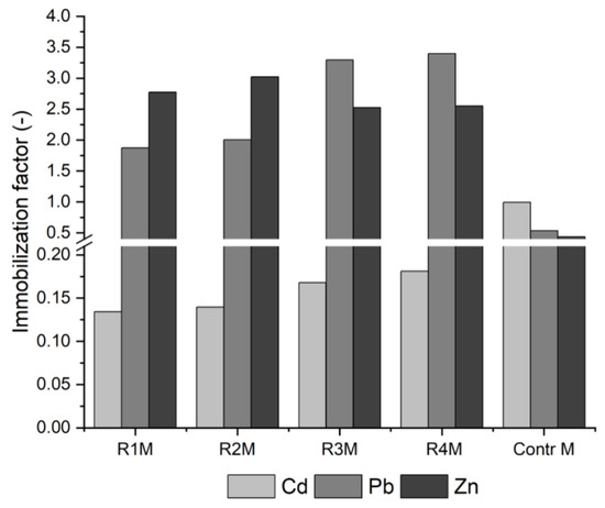 In order to investigate the effect of organic amendments on heavy metal immobilization in degraded soil from the zinc smelter area, the immobilization factor was calculated (Figure 7). It was considered that IF < 1 indicated a favorable effect of fertilization on heavy metals immobilization in the soil, while IF > 1 proved the effect of contributing to the immobilization of heavy metals. For cadmium, IF was similar for all pots and did not exceed the value of 0.2 except for the control sample. For Pb and Zn, immobilization factors increased after compost addition. In the case of lead, the IF value was the highest (>3) for soils where composts with 30% addition of sewage sludge were applied (R3, R4), while for Zn immobilization factors were higher (>2.5) in soils fertilized with composts R1 and R2.
