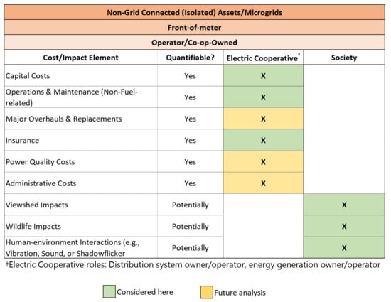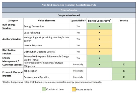 12] were not applicable to the given project. For example, given the isolated nature of the system, transmission-level benefits were not available. Green cells in the table indicate that that benefit is considered in this report, whereas yellow indicates benefits set aside for future analysis as more data becomes available.