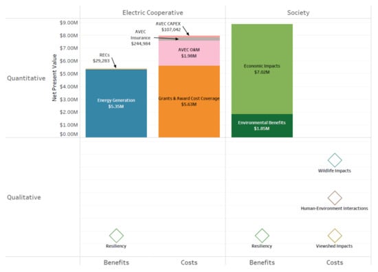 In this study, we explore the value of the St. Mary’s system using a bottom-up, comprehensive distributed wind valuation framework. This valuation demonstrates how benefits accrue to the relevant stakeholders, including the environmental and economic impacts of the project. We also discuss the qualitative value elements that may be impactful to the project, such as the resilience benefits of the turbine. Costs, both quantitative and qualitative, are similarly examined across perspectives. Following the analysis, we conclude that the total cost of the project to the cooperative, including that which was covered through grants and funding, in comparison to the benefits to the electric cooperative alone, provides a benefit–cost ratio (BCR) of 0.68, which is clearly unfavorable. It is only when additionally considering the societal benefits of economic and environmental benefits that the BCR is greater than one and reaches 1.79. The low BCR when only considering benefits to the electric cooperative suggests that public funding for similar projects may be important to their adoption and that such funding or incentives also have societal return-on-investment that should be considered.