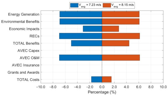 36]. Using the 6% value, two additional simulations were conducted at wind speeds of 7.23 (−6%) and 8.15 m/s (+6%) to capture the sensitivity of the results to the IAV; the impacts are shown in the sensitivity analysis in the section