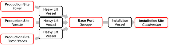 As noted above, the same supply chain applies to founding structures and top structures/turbines. Nevertheless, both activities require specialized tools on the jack-up vessel. For example, installing founding structures might require so-called hydro-hammers, while installing top structures requires heavy-duty cranes, equipment to work in great heights, and large free deck areas for transporting components. According to Vis and Ursavas [8], companies usually perform these activities sequentially to reduce set-up times and efforts. Therefore, they first install all foundations, then install the top structures, and, finally, perform the commissioning as a third stage. Accordingly, this article focuses on the second stage, the installation of top structures, as this stage involves more components and jobs to be handled by a single vessel. Nevertheless, the proposed models and approaches apply to the first stage without limitations.