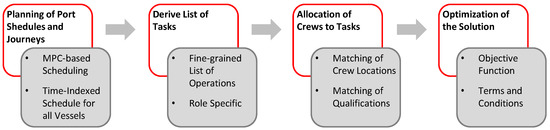 As described later, this article follows the latter strategy: The proposed framework first obtains an optimal plan for each vessel, denoting which operation should start and finish at which point in time. This plan mainly minimizes vessels’ makespan and associated costs, which inflict the highest costs [10]. Afterward, this article applies the proposed crew scheduling model, minimizing the number of crews or persons required to satisfy this plan. Most articles follow a similar approach and assume fixed operations or trips for the crew scheduling. John et al. [26] propose a procedure that applies to the proposed framework and fairly well describes the extensions needed for the MPC-based scheduling approach (Figure 2).