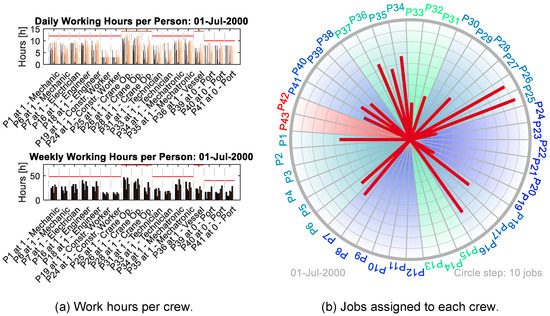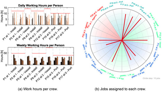 Figure 5 exemplary shows one of these scenarios in more detail. The scenario applies two installation vessels and selects the starting date as 1 July 2000. Figure 5a shows the distribution of working hours for each assigned crew per day and week for this scenario. The figure demonstrates that the model satisfies all restrictions. Moreover, the vessel crew shows a comparably low utilization if only considering installation-related tasks for this crew. Finally, Figure 5b shows the number of assigned jobs per crew. The figure shows that the crew scheduling did not assign any agency crews and avoided other available crews, as described above.