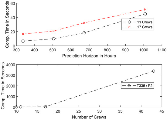 Besides showcasing the model’s general ability to handle different levels of detail flexibly, this scenario allows a more detailed investigation of the model’s runtime behavior considering the number of crews. In general, scheduling problems belong to the class of NP-hard, in most cases NP-complete problems. As the proposed model employs a time-indexed formulation, the complexity mainly depends on the number of personnel and the planning horizon. To allow a closer examination of these influences, Figure 7 depicts the computational time for selected experiments. The experiment covers additional simulation runs using the base scenario and varying prediction horizons, using a sampling width of one and two weeks and two and three prediction periods each, to establish a baseline for the influence of the planning horizon.