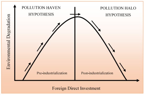 Many economies try to enhance the level of economic growth and control environmental pollution; thus, globalization is playing a significant role in improving environmental quality through FDI transferred from the developed nations to less technologically advanced economies. Fiscal policy is hugely affected by globalization. It assists in determining capital and trade inflows. Developing economies require public investment in order to attract foreign direct investment and to obtain access to a worldwide market. The Corona virus (COVID-19) outbreak has interrupted international trade, government spending, and tourism, all of which have had an impact due to globalization [9]. In the last few years, cumulative globalization and its drawbacks have contributed to a world environmental disaster and brought about the recent COVID-19 as an expression of years of ecological destruction and human involvement in ecological systems [10]. Finance and trade openness are significant aspects in speeding up the development of the liberalization of economies. Due to the globalization process, liberalization is commonly known as a quick improvement or enhancement in inflows of information, skilful labour, and goods and services from one country to another country [11]. Foreign companies use advanced technologies and better management practices that are conducive to reducing CO2 emissions in host countries. The pollution haven hypothesis (PHV) states that there is a positive connection between foreign direct investment (FDI) and CO2 emissions [12]. Developed countries have more strict environmental regulations. To avoid the extra cost of holding to these rules and regulations, most companies of developed countries transfer their manufacturing to the developing economies with minimum onerous environmental limitations [13,14]. Figure 1 shows the typical inverted U-shaped association between FDI and CO2 emissions; both are reflecting pollution halo and haven hypotheses. Based on the above discussions, this research aims to examine the influence of globalization and fiscal policy on CO2 emissions in 105 countries from 1990 to 2016. The possible contributions of this research to the previous literature are fourfold: (1) According to the best of the authors’ knowledge, this is the first research to discover the consequence of fiscal policy on CO2 emissions in the era of globalization. (2) The impact of foreign direct investment (FDI) on CO2 emissions is also examined; thus, the validity of the pollution haven hypothesis (PHV) or pollution halo hypothesis (PHL) is also evaluated. (3) This empirical study employs the full modified ordinary least square (FMOLS), dynamic ordinary least square (DOLS), and autoregressive distributed lag (ARDL) approaches in a linear way; however, for the estimation of nonlinear panel estimation, we applied panel threshold regression (PTR) for the observed countries, which has not been carried out before. (4) Another contribution is that the previous literature fails to classify the exact level (threshold point); this is the first research to investigate the threshold level among fiscal policy and CO2 emissions in the era of globalization.