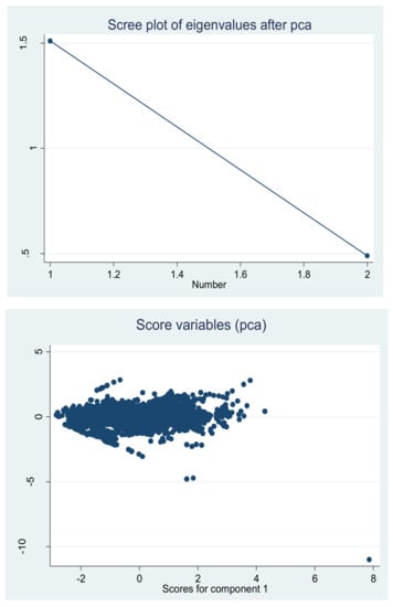 where subscripts i represent the cross-sections (i = 1, 2….105), t represents the time period (1990–2016), and represents stochastic error terms. The intercept term is denoted by , and are the parameters to be anticipated. In addition, CO2 presents the carbon dioxide emissions per capita; FP is a fiscal policy that has been constructed through principal component analysis (PCA) with two different indicators: first is overall government spending (GSP) as a % of GDP and second is overall tax revenues (TR) as a % of GDP. The TGL shows the total globalization index; foreign FDI denotes foreign direct investment; FD illustrates financial development; URP represents urban population; TRD shows trade openness; LF presents labour force; GCF explores the gross capital formulation. All the data for the variables are attained from the World Development Indicators of World Bank [55] database, excluding the measure of the globalization index, which will be obtained from the KOF Swiss Economic Institute updated by Gygli et al. [56] and Dreher [57] and the overall tax government spending variable has been attained from the International Monetary Fund (IMF) [58]. A detailed description of these variables is presented in Table 1. Moreover, the findings of PCA are presented in Table 2. In addition, Figure 2 shows the graphical presentation of scree plot and score variables of government spending and tax revenue for these studied countries.