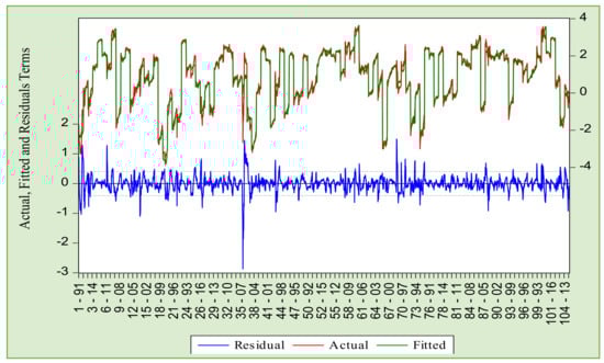 Similarly, the urban population also exerts a negative impact on CO2 emissions in the world panel countries. Particularly, a 1% increase in urban population will minimize CO2 emissions by 0.258% in the long run. This finding is similar to the results explored by Yang et al. [86]. The possible reasons for the adverse effect of urban population on environmental degradation are as follows, for instance, when the level of urban population is increased, the rural population moves from rural to urban areas to attain better education or skill, as a result improving the human capital, and most of the population will prefer a clean environment with a lower emissions level. Moreover, the labour force has an adverse effect on CO2 emissions in the long run. More specifically, a 1% boost in labour force will lead to a 0.135% reduction in CO2 emissions in the region. This is due to the fact that when the demand for labour force increases because of more industrial activities, production processes that need more energy resources are elevated. In this regard, most of the energy sources in these countries are based on non-renewable fossil fuel energy consumption. One other reason for the positive impact of the labour force on carbon emissions is that the labour of these countries is not well educated regarding environmental protection. Therefore, this will ultimately exert huge pressure on the environment. This finding is consistent with the findings of Wang et al. [87]. In contrast, gross capital formation confirmed the positive influence on CO2 emissions. Particularly, a 1% increase in gross capital formation will lead to an enhancement in CO2 emissions by 0.1661% in the long run, and these outcomes are consistent with the previous study by Etokakpan et al. [88]. This finding indicates that in these countries, higher per labour resources and their associated capital are not reliable with energy-proficient and eco-friendly green technologies, as Ling et al. [89] observed that higher gross fixed capital per unit of labour has some ability to protect environmental quality if it is directly linked with energy-efficient and environmentally friendly green technologies. Additionally, Figure 4 shows the actual, fitted, and estimated terms of CO2 emissions by LCO2 = f (LFP, LTGL, LFDI, LFD, LTRD, LURP, LLF, and LGCF) for global panel countries in the long run.