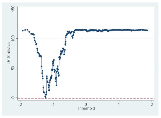 In order to examine the panel threshold approach as developed by Hansen [74,75], this study has applied the bootstrap technique, which permits the structure of a confidence interval and evaluation of the statistical consequence of the threshold level identified. Therefore, we first estimated the single and multiple threshold models and, interestingly, found a single threshold to be significant at the 1% level, while two and three thresholds appeared to be insignificant. For the single threshold, we found a significant value at the 1% level. This finding implies the nexus between fiscal policy and CO2 emission. The threshold point of −1.2889 is critical and specifies a turning point at which level the effect of fiscal policy on CO2 emission is significant. The findings present important policy implementations for policymakers and regulatory authorities to maintain a minimum point of fiscal policy at −1.2889 in order to obtain more positive advantages of fiscal policy, because when fiscal policy drops under this level, it could have a negative effect on CO2 emissions. To be more specific, governments need to pay serious attention to increasing fiscal policy above the −1.2889 threshold level. Figure 5 graphically illustrates the threshold regression. The relevant results and statistics of the threshold are presented in Table 9 and Table 10, respectively.