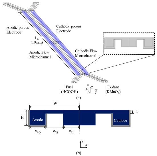 - Khabbazi, A.E.; Richards, A.J.; Hoorfar, M. Numerical study of the effect of the channel and electrode geometry on the performance of microfluidic fuel cells. J. Power Sources 2010, 195, 8141–8151. [Google Scholar] [CrossRef]