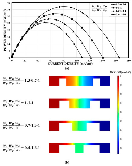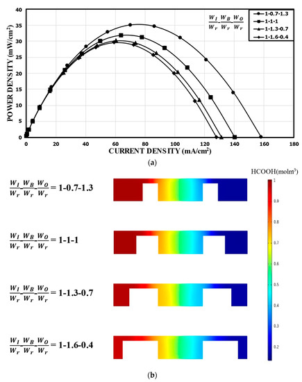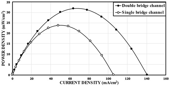 - In comparison to the single-bridge channel, the reference double-bridge channel with equal sub-channel widths showed a 34.0% higher peak power density (31.88 mW/cm2), which demonstrates the superiority of the proposed MMFC flow channel shape.