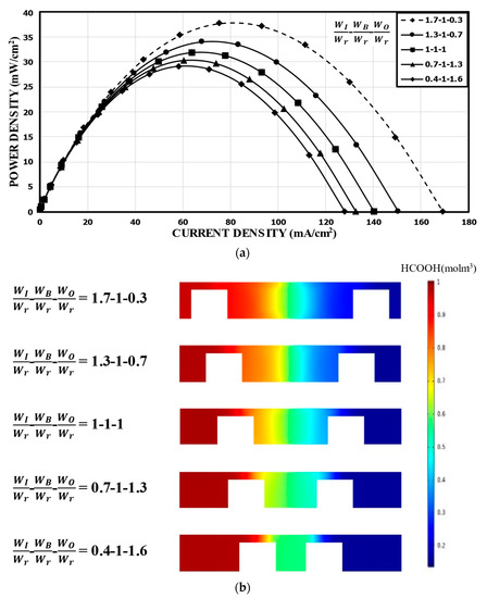- In the case with fixed WB or fixed WO, the power density increased with WI. The main reason was proved to be the reduced thickness of the mixing region in the inner channel with the increased WI. In the case with fixed WB/Wr = 1.0, WI/Wr = 1.7 (WO/Wr = 0.3) showed about an 18% higher peak power density compared to the reference channel. However, compared to this case, with varying WO, the case with fixed WO/Wr = 1.0 showed more than double a larger variation in the peak power density in the range of WI/Wr = 0.4–1.3. This is because the negative effects of varying WO, such as reducing the area around the electrode in the outer channel and increasing the distance between the electrodes, were removed in this case. WB/Wr = 0.7 (WI/Wr = 1.3) showed about a 15% higher peak power density than that of the reference channel.