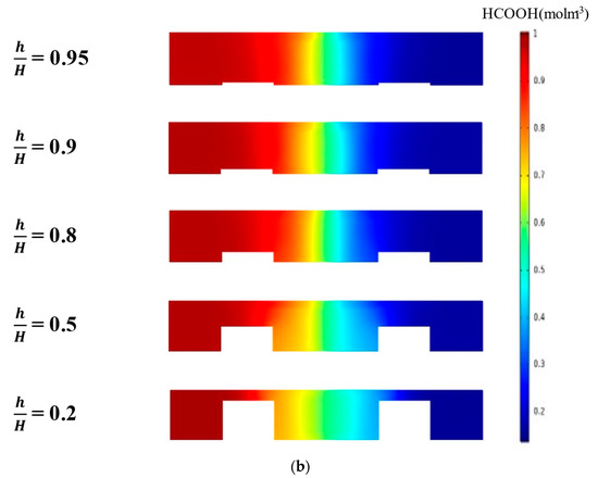 - The height of the double-bridge structure had the greatest effect on performance, as expected. As h/H increased, the peak power density reached a maximum at h/H = 0.9, which was 171% higher than that of the reference channel (h/H = 0.2). The concentration contours of fuel showed that the thickness of the mixing region reduced as h increased, and the reduction rate was higher for smaller h/H.