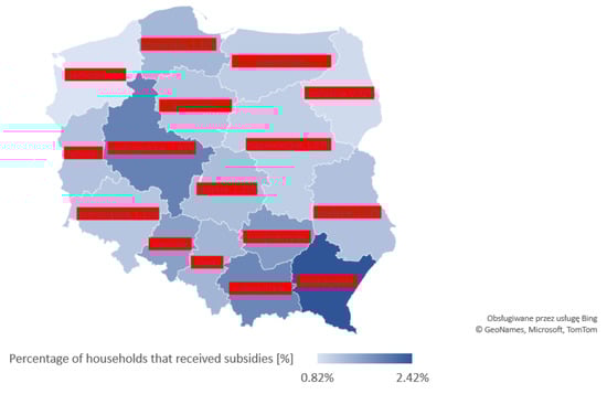 As presented in Appendix A, the largest number of subsidies was granted in southern Poland (Podkarpackie, Małopolskie, Świętokrzyskie, Opolskie voivodeships) and western Poland (Wielkopolskie voivodeship). These voivodeships are agricultural and forested areas. 50% to 68% of these areas are rural municipalities. Additionally, between 26% and 38% of the area of these voivodeships is covered by forests. According to the data of the Central Statistical Office, these are low-income voivodeships.