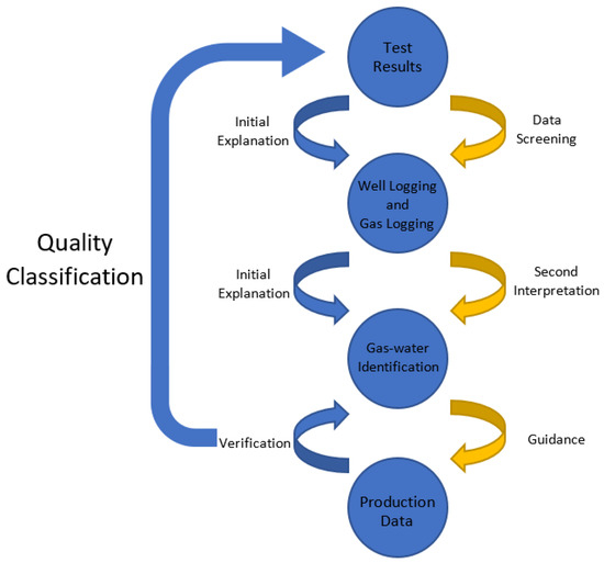 Based on these methods, it is possible to qualitatively and quantitatively evaluate the gas-bearing properties of the reservoir through logging interpretation. Then use the gas test data as the test basis to verify the conclusion of the second interpretation. However, in the process of gas testing, the quality of the test results will be different due to different construction equipment and gas test methods. The quality of the test results will directly affect the qualitative judgment of the fluid properties [49,50]. It will cause great difficulties in the evaluation of the logging gas-bearing property in combination with the actual interval. Due to the strong inconsistency between the logging and test results, the test results are difficult to provide effective training samples or test basis for the judgment of gas layers, gas and water layers, and water layers [51]. Ultimately it will affect the establishment of effective fluid identification standards. In actual production, a single perforation gas production rate is used as the most favorable criterion for judging the quality of a certain reservoir interval, but the accuracy of the test results has always been ignored [52,53]. Therefore, to clarify the fluid properties of the reservoir, we must use production and development data as the inspection basis to ensure the accuracy of the test results. Then make a qualitative judgment of the gas or water layer. Finally, the gas–water identification study of the reservoir can be perfected according to the characteristics of the logging response curve. The specific research ideas are shown in the figure below (Figure 2).