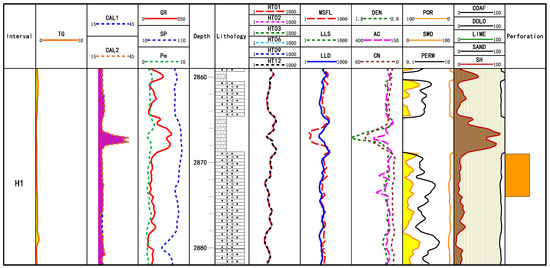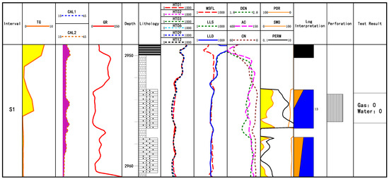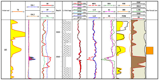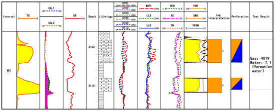 For the actual well data in the study area, the thickness of the perforated layer in Well X1 is 3 m (Figure 3). The gas-logging total hydrocarbon of this layer is very high. This layer is less affected by diameter expansion and mud intrusion. The formation information reflected by the logging curve is more real, and the resistivity value is 62.3 Ω·m. The core analysis porosity is 8.29%. The resistivity, core porosity and gas logging measurement values of this layer are all high, which belongs to a typical gas layer; the conclusion of perforation is also a gas layer. The test gas production volume is 16,952.4 m3, and the water production volume is 13.6 m3. It is a typical layer in which the test data are consistent with the logging data. This type of layer is common in the study area, and the test results have good consistency with the logging data. It can be used as a standard sample layer with good test quality.