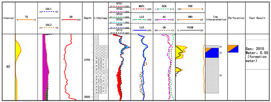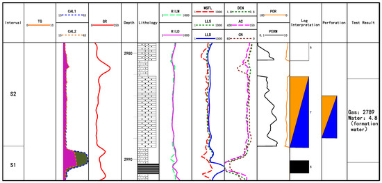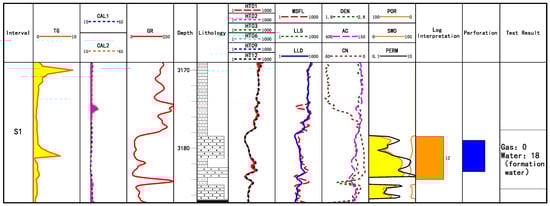For the perforated layer of Well X8 (Figure 17), the conclusion of the perforation is a gas layer. The layer thickness of this layer is 4 m, the average deep lateral resistivity is 30 Ω·m, the porosity is 11.1%. The injected sand volume is 28.3 m3 and the working fluid completely flowed back, the test gas production volume is 686 m3, and the water production volume is 6.86 m3. The resistivity and porosity are good, and the test productivity is good as well, and only a small amount of water volume is produced. After rechecking the test results, it should belong to a typical gas–water layer, but the conclusion of perforation is a gas layer. The test quality of this layer belongs to level II. In the subsequent production and development, the development has stopped after the cumulative output of 4553 m3 had been obtained.