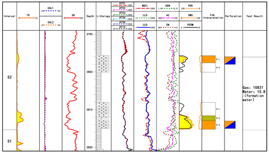 In the tight sandstone reservoir section of the study area, the logging curve is affected by the formation and borehole environment and cannot accurately reflect the reservoir fluid information [54]. The correlation between test data and logging data is poor, and the corrected log curve needs to rely on the test results as the inspection standard. Therefore, we need to judge the consistency between the test data and the logging curve characteristics based on the gas logging, initial logging interpretation and production data. Combining the test results with the resistivity, core porosity, gas measurement and other data of the interval, the intervals with higher conformity are selected as the standard sample with better test quality. Then, we carry out the evaluation of the quality of the test results and analysis of the reasons for the inconsistent layers, and determine whether the original logging curve needs to be processed. Finally, we completely finish the inspection work for the identification of gas and water layers.