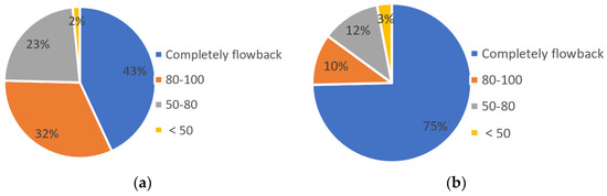 The higher the flowback rate, the less fracturing fluid stays in the formation, and the less damage to the formation, and the more gas produced by the initial gas well test [67]. According to the statistics of the flowback rate of 176 perforation sections in the study area (Figure 10), the flowback rate of all fluid types is 60% at most, the layers with a flowback rate of 50% to 80% account for about 22%. The flowback fluid in the layers with a rate of 80% to 100% has little impact on the formation, the identification of gas and water layers is also more accurate, and the test results are in good agreement with the logging response characteristic values. However, for the layers where the flowback rate is 50% to 80%, the gas test results should be carefully selected, and well logging data should be combined with subsequent production and development data for inspection. For the layers with flowback rate lower than 50%, the test result is unreliable. Gas logging, well logging, gas testing, production and other data should be used for qualitative judgment and evaluation.