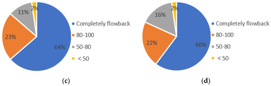 Statistical graphs of the flowback rate of perforation section of different fluid types. (a) gas layers, (b) gas and water layers, (c) water layers, (d) total perforation section.