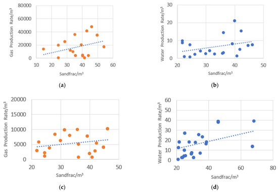 Relationship between sand injected volume and gas/water production. (a) sand injected volume and gas production in gas layers, (b) sand injected volume and water production in gas and water layers, (c) sand injected volume and gas production in gas and water layers, (d) sand injected volume and water production in water layers.