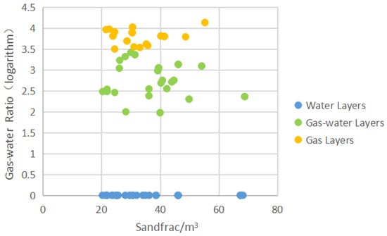 Drawing the intersection chart of injected sand volume–gas/water ratio for the layers where the perforation conclusion is gas layer, gas–water layer, and water layer (Figure 13). As shown in Figure 12, the following conclusions: chart is clearly partitioned, gas–water ratio higher than 3.5 can be identified as a gas layer; less than 3.5 and greater than 0 can be identified as a gas–water layer; equal to 0 can be identified as a water layer, but if there is a situation where the gas production and water production are both 0 m3, we need to evaluate this layer separately based on the well logging data and fracturing.