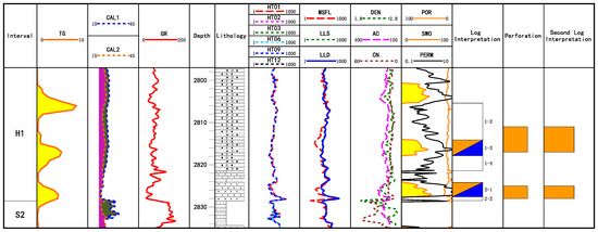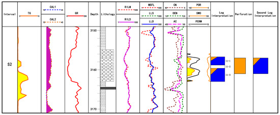 The thickness of the perforated layer in Well X2 (Figure 7) is 3.5 m, the deep lateral resistivity value is 39.322 Ω·m, and the porosity is interpreted as 10.833%. Its electrical and physical properties are good. According to gas logging and well logging data interpretation, the conclusion is considered to be a gas–water layer. During the construction, sand fracturing was used to reform the layer. The amount of injected sand volume in the perforation layer is 18 m3, the injected liquid volume is 188 m3, and the flow-back liquid volume is 190.9 m3, and the flowback rate is 85.3%. The swabbing method was used in the gas test, the gas production and the water production are both 0 m3. After testing, the conclusion of the perforation gas test is dry layer. This conclusion is completely inconsistent when the conclusion is a gas-bearing water layer through gas logging and well logging.