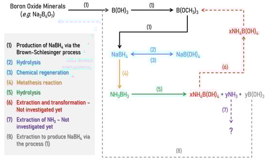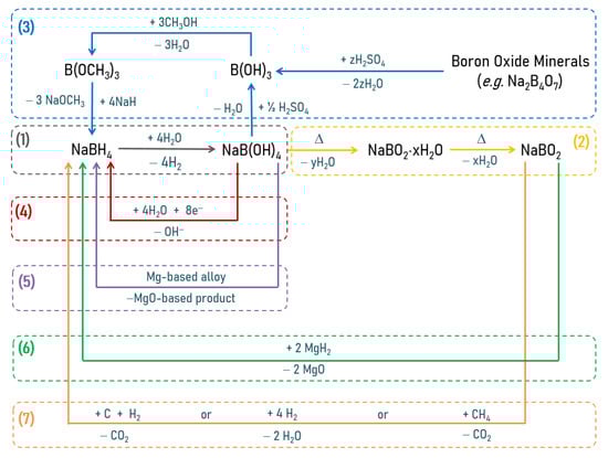 Hydrogen cycle with sodium borohydride: (1) hydrolysis of NaBH4; (2) dehydration of the hydrated borate product NaB(OH)4; (3) Brown–Schlesinger process used for the commercial production of NaBH4; (4) electroreduction of NaB(OH)4 for regenerating NaBH4; (5) chemical reduction of NaB(OH)4 by means of a Mg-based alloy; (6) chemical reduction of NaBO2 using magnesium hydride; (7) chemical reduction of NaBO2 using various reducing agents.