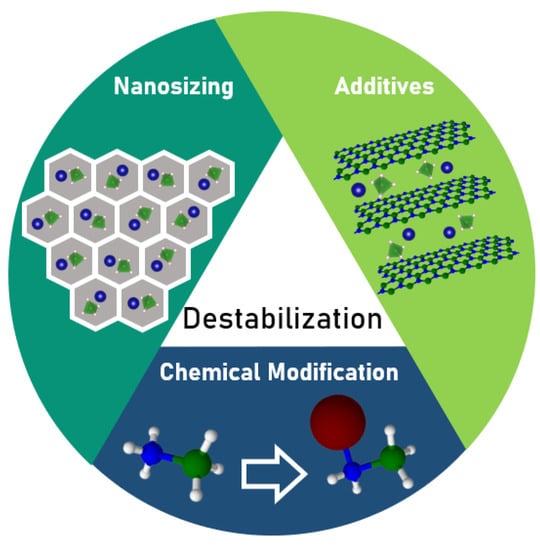 In general, there are three approaches that have been considered to destabilize boron-based compounds: the incorporation of an additive, the chemical modification and the nanosizing of the compound (Figure 4).