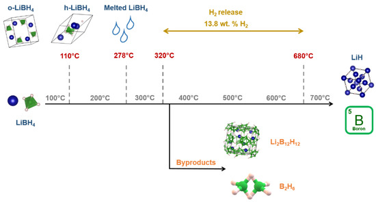 Being the lightest of the borohydrides, LiBH4 is a crystalline solid (orthorhombic, space group Pnma) with a density of 0.66 g cm−1 [71]. LiBH4 has been widely studied as a material for hydrogen storage applications due to its high gravimetric (18.5 wt. % H2) and volumetric (121 kgH2 m−3) hydrogen storage capacity. Unfortunately, the potential use of LiBH4 in the pristine state for hydrogen storage applications presents great disadvantages. First of all, the thermodynamics of LiBH4 presents a problem. Bulk LiBH4 undergoes different changes with the effect of temperature (Figure 5) [72]. A structural phase transition occurs at about 110 °C, changing from orthorhombic symmetry to the hexagonal one, followed by its melting at about 278 °C. Afterwards, the release of H2 begins [73]. A first desorption step was reported, starting at 320 °C, with a mass loss of 1 wt. % H2. The main dehydrogenation step starts at about 450 °C and peaks towards 500 °C. A total weight loss of 9 wt. % was measured up to 600 °C, which represents half of the hydrogen content of the compound. For practical applications, only 13.8 wt. % H2 can be released up to 680 °C. Temperatures above 700 °C are required to completely dehydrogenate LiH. It is obvious that these dehydrogenation temperatures are not suitable for practical applications.