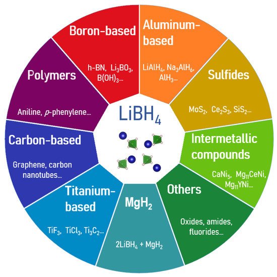 The addition of different compounds in order to destabilize LiBH4 have been studied. For example, it is known that the Hδ− of LiBH4 can be destabilized through the introduction of a Hδ+-containing species. Different research groups have tested several materials (Figure 6), and recent studies will be discussed in the following sections.