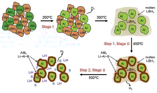 Al-based compounds are successful in destabilizing LiBH4, but the formation of stable compounds such as Li3AlH6 hinders the reversibility of the composites. Moreover, unidentified phases of Li-Al-B-H have been detected and the nature of their participation in the dehydrogenation mechanism is still unknown. Moreover, the formation of passivation layers of AlB2 and LiAl on the surface of Al also limits the dehydrogenation of the composites (Figure 7).