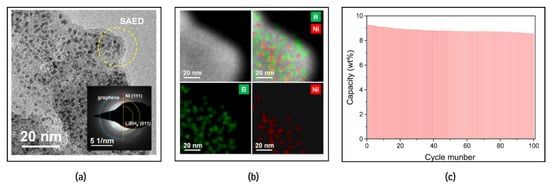 (a) Transmission electron microscopy (TEM) image; (b) energy-dispersive X-ray spectroscopy (EDX) mapping and (c) hydrogen cycling stability of nano-LiBH4 supported on graphene decorated with Ni. Reprinted with permission from [99]. Copyright (2021), Elsevier.