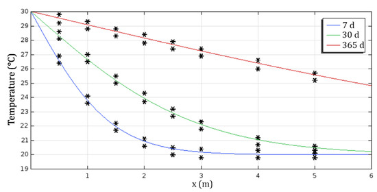 Comparison of the temperature profiles obtained numerically (continuous lines) with those of the EN 15026 standard (asterisks).