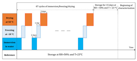 However, for harsh climates, where the climatic conditions are variable (e.g., Canada), another type of accelerated aging was used in the laboratory to characterise the extreme degradation case of these materials. The latter consisted of applying successive 48 h wetting cycles, followed by a freezing phase at −18 °C, over 24 h. It ended with drying in a climatic chamber at 50 °C, for 72 h. As illustrated in Figure 4, the entire design lasted 42 days. This protocol reflects the extreme degradation that hemp concrete can undergo after several years of use under harsh conditions.
