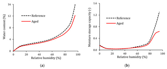 The water vapour adsorption isotherms and moisture storage capacities of aged and reference hemp concrete are shown in Figure 5a,b, respectively.