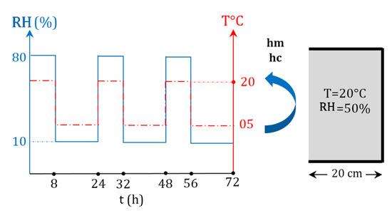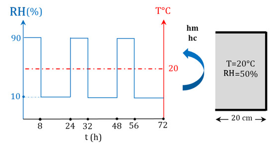 The isothermal case is illustrated in Figure 6. The temperature was set as a constant while the relative humidity varied with time. A sample of 20 cm of hemp concrete was submitted to a moisture flux on one face for 72 h. The other material faces were assumed to be adiabatic and impermeable, to ensure a unidirectional transfer. The total pressure was assumed to be constant in this case. The initial and boundary conditions are given in Figure 6.