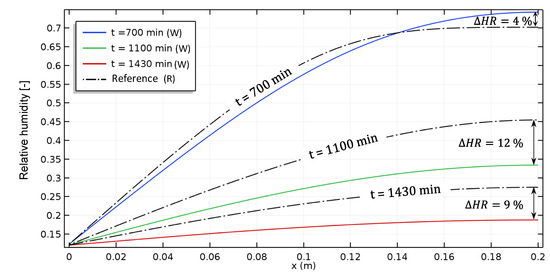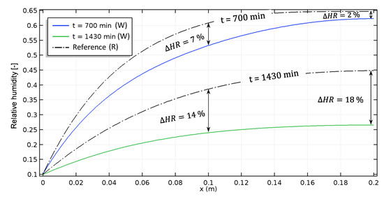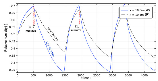 Furthermore, the kinetics of mass transfer are faster in the aged material. As can be seen in Figure 9, during the humidification process, the relative humidity in the aged material is higher than the reference one. The amplitude is also higher. However, during the drying phase, the relative humidity becomes lower and reaches the defined boundary condition faster. In addition, a small offset in the dynamics was also noticed between the two materials. The maximal offset reached 24 min. This faster kinetic is due to the increase of the vapour permeability of the aged material, leading to a reduction of the vapour diffusion resistance.