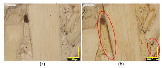Photograph showing the effect of aging on the microstructure of hemp concrete: (a) reference hemp concrete; (b) aged hemp concrete.
