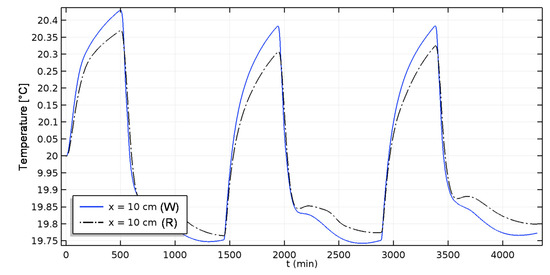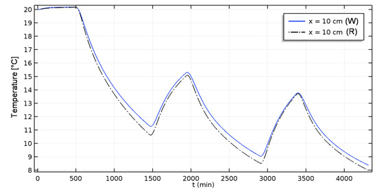 Non-isothermal case: Temperature profiles of aged and reference hemp concrete (W: Weathered; R: Reference).