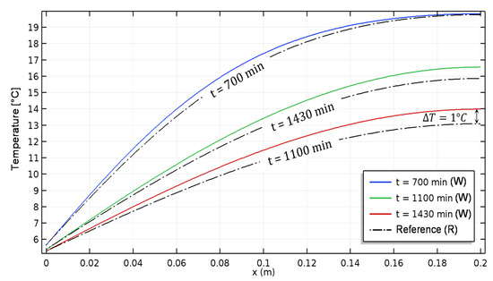 In Figure 15, an offset of 40 min can be observed in the dynamic mass transfer. This difference in the kinetics of mass transfer leads to non-negligible discrepancies in the prediction of the physical phenomena. Moreover, those discrepancies are higher for this case than for the non-isothermal one. Indeed, the model considers the effect of mass transfer under temperature gradient: the so-called “thermo-diffusion effect” [35,36,37].