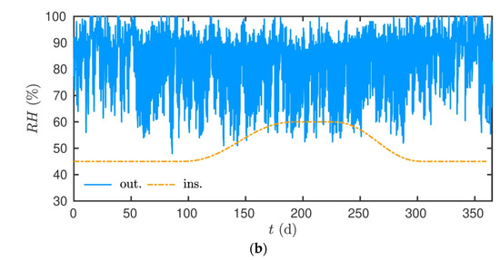 Inside and outside boundary conditions applied to the studied wall: (a) Temperature; (b) Relative humidity.