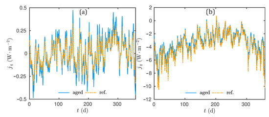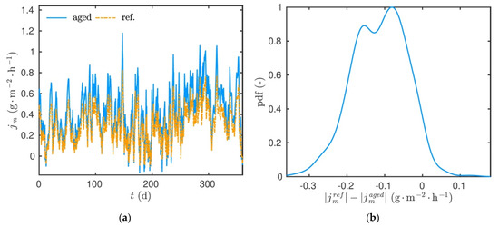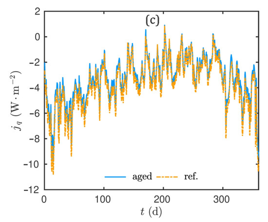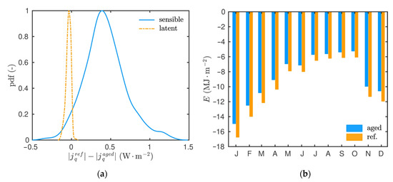 Figure 17a–c shows the time evolution of the latent, sensible and total heat flux, respectively. In addition, Figure 18a gives the probability density function of the difference of heat flux between both configurations. The sensible heat flux is overestimated by the simulation considering the reference material properties. Inversely, the latent heat flux is underestimated for the same configuration. These results are consistent with the previous ones and the modification of the macroscopic material properties, particularly the vapour permeability and the thermal conductivity. The primer is higher, while the latter is lower, for the aged material. One can remark that the sensible flux has a higher magnitude than the latent one for both configurations. Thus, the total flux is higher in the reference configuration. As a consequence, the conduction loads are lower in the case of aged material, as illustrated in Figure 18b. In other words, the thermal efficiency is improved with aged materials.