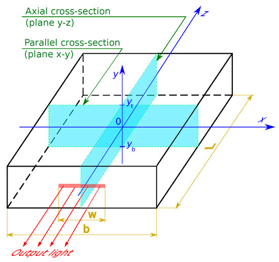 Note that indicates the bottom of the laser chip if one assumes the ideal heat sink (). Taking into account the nonideal heat sink (finite ) requires increasing the dimensions and b and was thoroughly explained in Ref. [14].